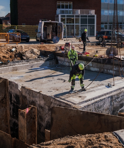 “4-5 meter fra bunkeren, vi skal udskifte, er der installeret akvarier med zebrafisk, som bruges i forskning. Derfor har vi droppet hydraulikhammeren til nedbrydningen, og i stedet skærer vi os forsigtigt ned gennem bunkeren oppefra og løfter den op i blokke.”